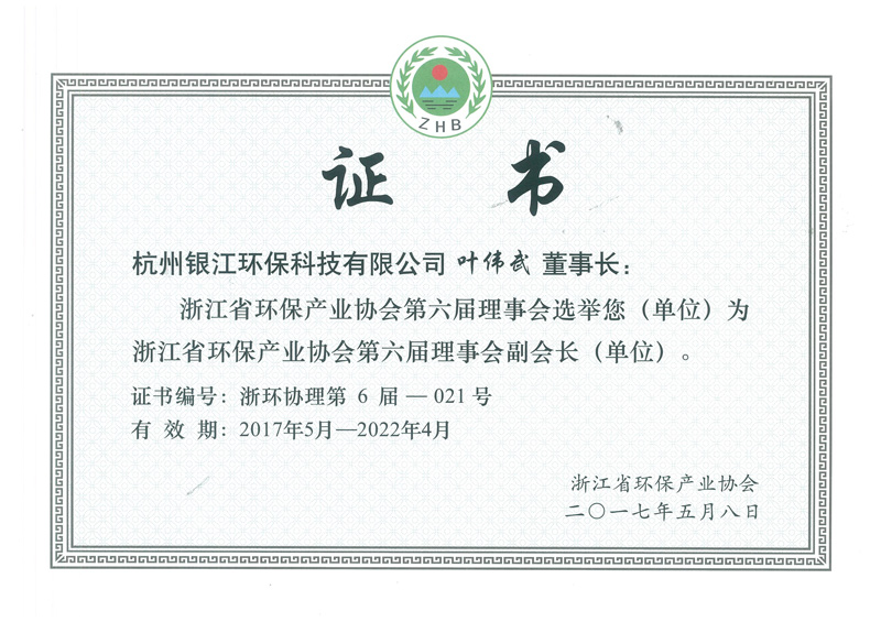 浙江省環(huán)保產(chǎn)業(yè)協(xié)會第六屆理事會證書