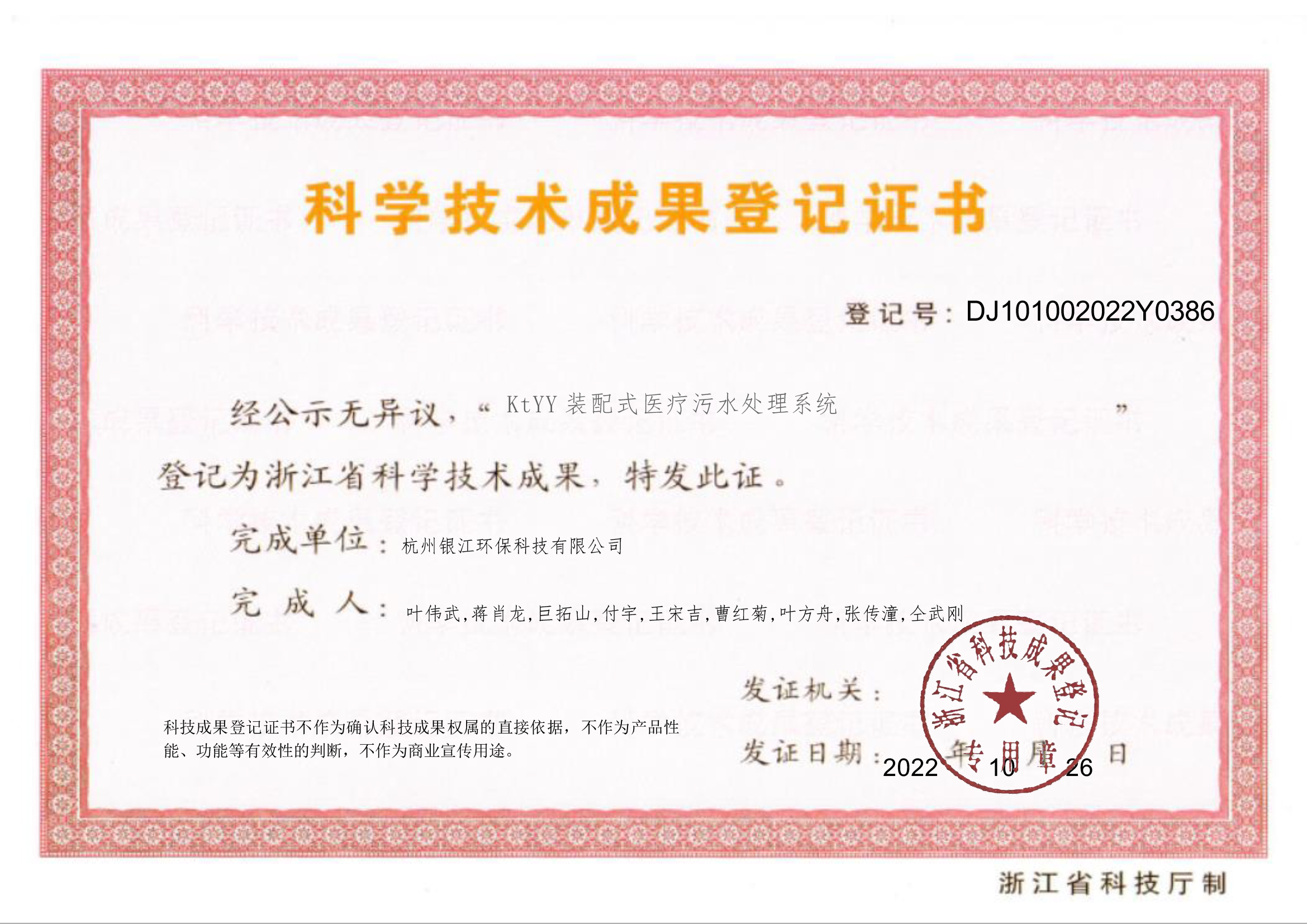 KtYY裝配式醫(yī)療污水處理系統(tǒng)新產(chǎn)品評價(jià)證書