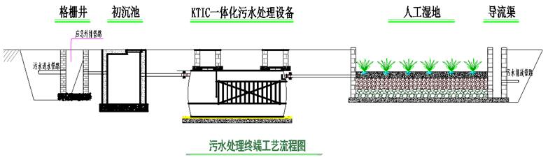 工藝流程:生活污水→格柵井→初沉池→KTIC一體化污水處理設備→人工濕地→導流渠