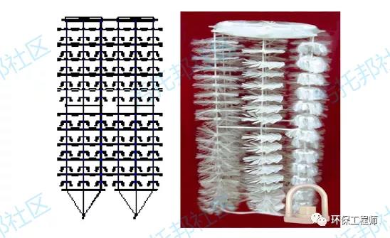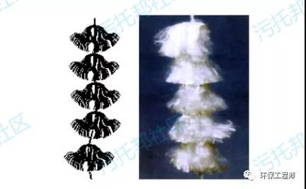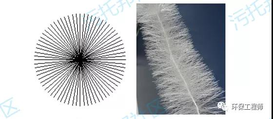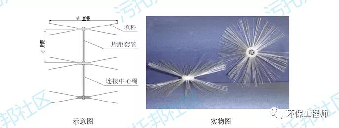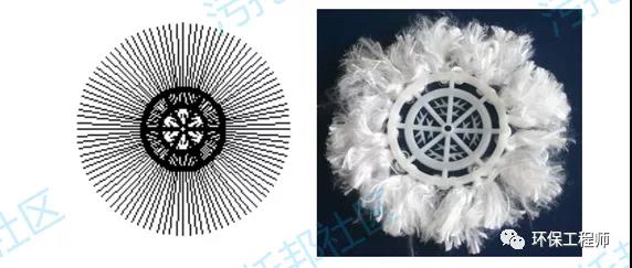 3. 彈性填料比半軟性填料更富剛?cè)岵⒓妫涞?1 代結(jié)構(gòu)呈瓶刷狀(見(jiàn)下圖 3);其第 2 代呈片狀,且剖面呈 X 形燕尾狀,彈性絲隨中心扣周邊放射(見(jiàn)下圖 4),該填料具有更大的空隙率、更高的氣泡切割能力;可提高氧利用率,是一種節(jié)能型的彈性立體填料。規(guī)格如表 3、4。