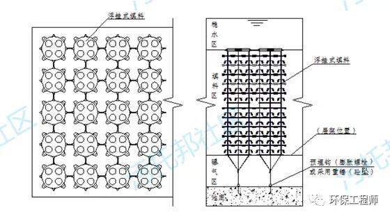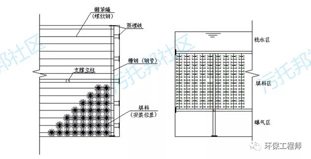 a) 懸掛式填料的組裝需兩端固定,一般宜采用橫拉梅花式和直拉均勻式。b) 接觸氧化池宜設(shè)置兩層懸掛支架,將填料兩端固定在支架上,底層支架應(yīng)高于曝氣頭 200mm以上。支架宜采用不銹鋼管、角鋼、槽鋼及繃緊繩等材料。a) 浮掛式填料僅需底端固定,宜直接固定在池底預(yù)埋鉤或膨脹螺栓吊鉤上。b)在接觸氧化池設(shè)置分層固定屜架,將浮掛式填料底端固定在屜架上。c)老池改造可采用重墜或砼墜固定浮掛式填料的底端。d) 填料層應(yīng)高于曝氣頭 200mm 以上。填料支架宜采用不銹鋼管、角鋼、槽鋼等材料。a) 宜在池底設(shè)置格網(wǎng),格網(wǎng)應(yīng)高于曝氣頭 200mm 以上。b) 在接觸氧化池的進(jìn)出口設(shè)置格網(wǎng),格網(wǎng)的網(wǎng)孔應(yīng)小于填料的外形尺寸。c) 單池尺寸較大時(shí),宜用格網(wǎng)將接觸氧化池分為若干個(gè)單元,在每個(gè)單元內(nèi)投加填料。d) 單池長(zhǎng)寬比過(guò)大時(shí),可以設(shè)置氣提裝置將出口端的填料回流到進(jìn)口端。