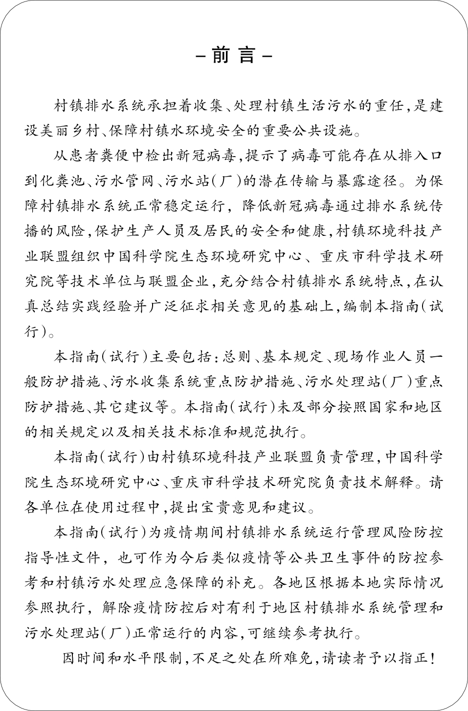 為了更好地指導村鎮污水處理領域的各參與主體科學管理、有效防控,保障村鎮排水系統正常穩定運行,降低疫情期間病毒通過排水系統傳播風險,保障生產人員及居民的安全和健康,由中國科學院生態環境研究中心、村鎮環境科技產業聯盟、重慶市科學技術研究院主編,銀江環保應邀參編的《疫情期間村鎮排水系統運行管理風險防控工作指南》(試行)(以下簡稱“《指南》”)于3月23日正式發布。